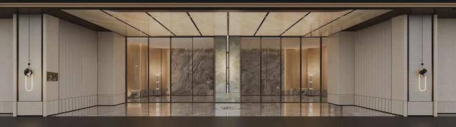 第二重,首层大堂,约9米奢阔挑高,多种石材与贵金属碰撞,石材为原产地拼接,犹如进入了奢石博物馆,有里子,更有面子。