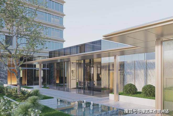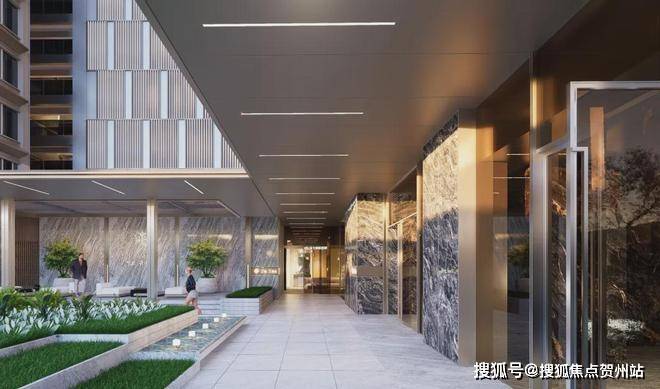 第五重,雅奢单元大堂,叠水花园与单元对景,增强入口的归家氛围。