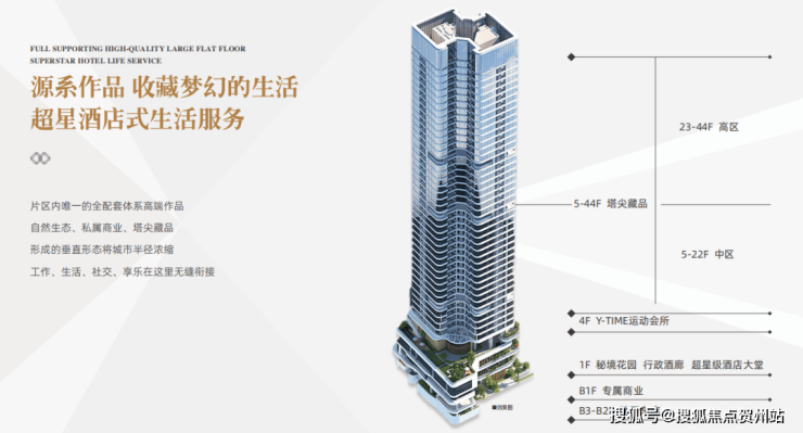 项目位于深圳深南大道与文锦路的交汇处,建面约8.12万㎡,地下3层,地上44层,融合了星级俱乐部、塔尖藏品、商业、休闲、生态等业态,提供建面约60-108㎡法拉利总裁空间和建面约227-249㎡高定大平层,共324席。