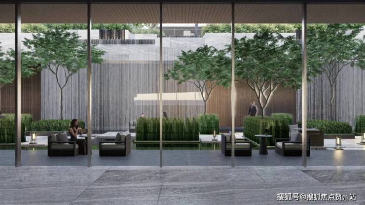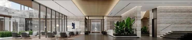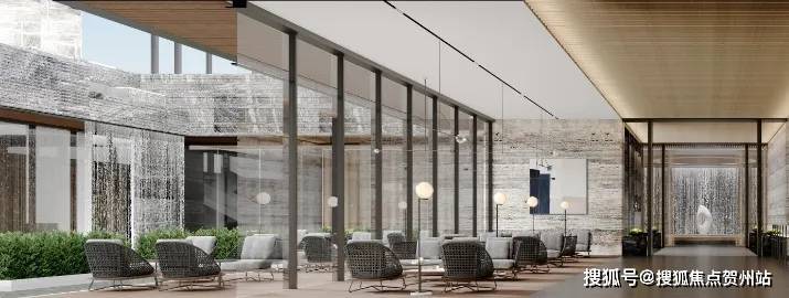 首先是“颜值社交”,奢华酒店式的社区大门,气场全开。无雨落客区能容纳6辆车同时落客,前庭环形艺术回廊利用超高颜值的玻璃砖打造出“水晶宫”。地下车库入户大堂前车马厅设计,借鉴了“港式归家”的理念,一般多在香港高端酒店采用,作为归家的第二道门,既温馨明亮,又超具昭示性。酒店式归家大堂与定制化下沉会所相结合,在负一层引入瀑布景观,整个景观体系更加立体。