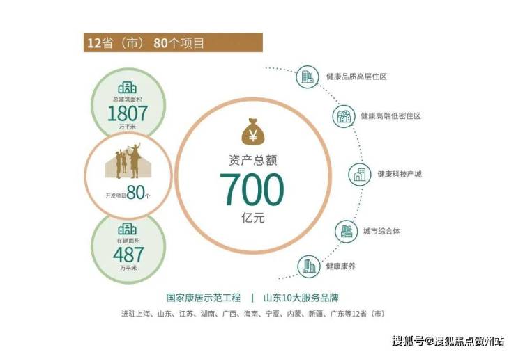 旗下健康置业进驻上海、山东、广东、海南、新疆等12省(市),开发项目80个,荣获中国品牌房地产100强,省属国有企业中最大康养地产开发企业等荣誉资质。打造国家康居示范工程,国匠实力,值得托付。