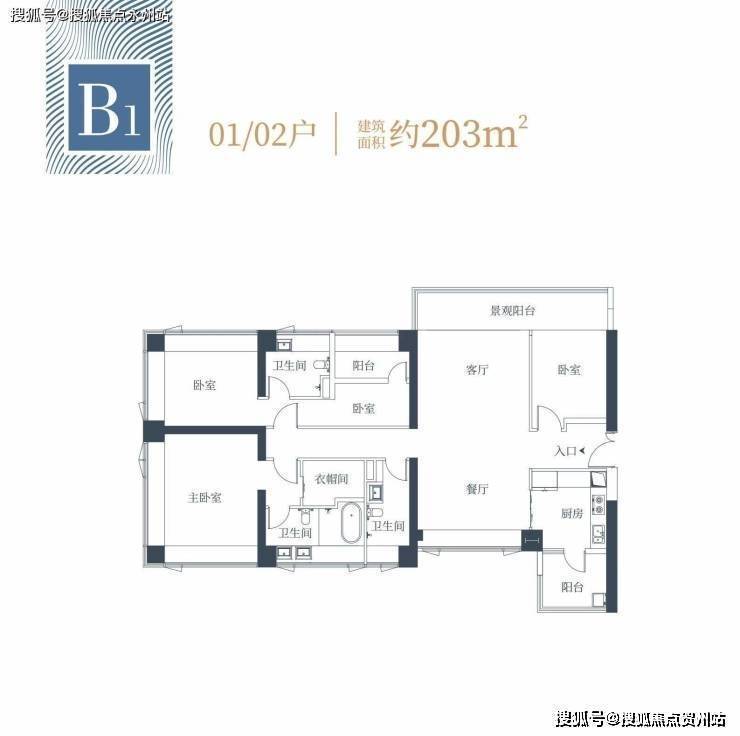 B1户型约203㎡3+1房两卫(1栋2单元01/02户型)竖厅双龙抱珠格局,餐客一体,阳台连通次卧,同时满足生活和观景两个功能;需要靠封阳台获取+1房,阳台东北朝向,距离大南山公园很近,视野景观不错