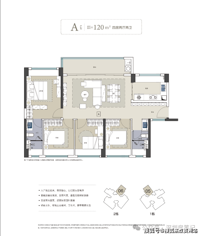 项目主推75-120㎡三至四房,使用率超80%,高赠送,三开间朝南,近享湖山生态景观,远看春笋城市地标。