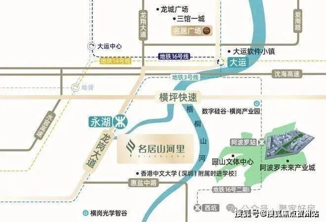 名居山河里,位于龙岗区园山街道3号地铁线永湖站东南侧150米,地处龙岗黄金三角地带,北邻大运新城,东侧是阿波罗未来产业城,西南侧是横岗中心片区。