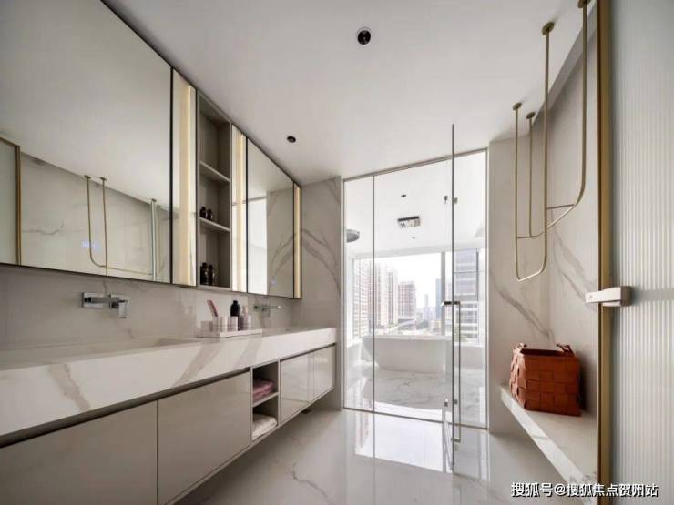 走进衣帽间,浅色调柜体似温柔容器,收纳生活诗意。卫浴间内,大理石的冷感与金色的暖意交织。玻璃隔断后,浴缸正对着城市天际,泡澡时可观云卷云舒,令身心于这方天地,与自然和精致一同沉醉。