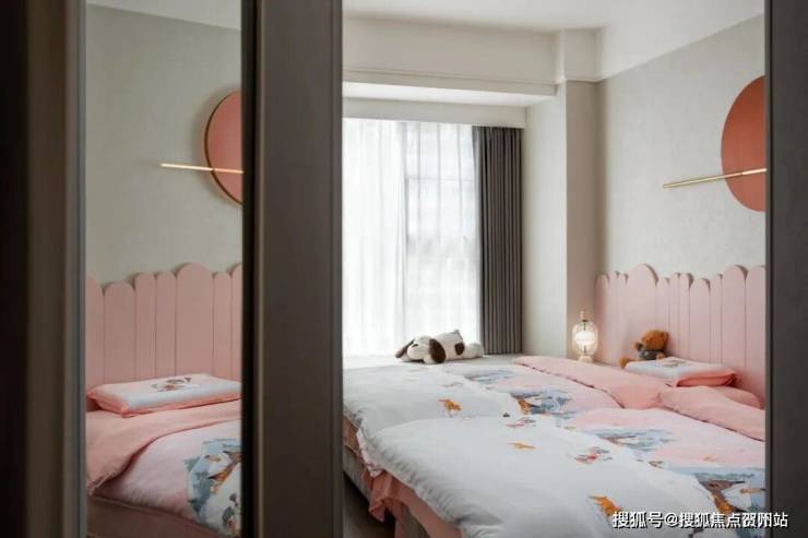 墙面以浅灰色打底,宛如轻柔云朵,为空间营造宁静氛围。床头那排粉嘟嘟的“花瓣”,好似童话中的魔法护盾,守护着甜美的梦境;上方圆形装饰仿若两颗小太阳,金属线条牵出暖光,照亮童年的奇妙幻想。
