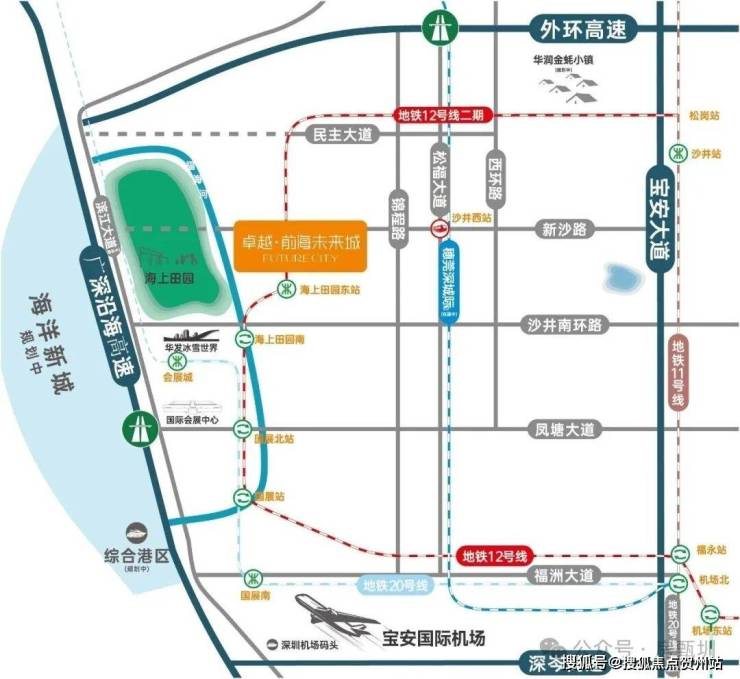 项目紧邻地铁12号线海上田园东站,步行仅300米,真正的地铁口物业!2站换乘20号线,6站换乘11号线快线,快速通达宝中、南山;穗莞深城际沙井西站距项目约1.5公里,未来接驳深茂铁路,联通珠江西岸;广深沿江、外环高速等环绕,自驾15分钟达宝安机场,立体交通网轻松实现湾区通勤。