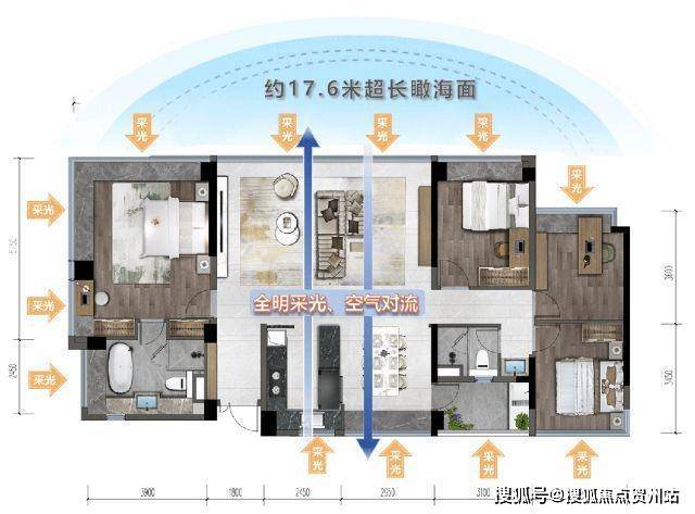 143㎡4房3厅2卫,五开间全明设计,整个户型拥有约17.6米超大面宽12大采光面,享受“类板楼”的居住体验。