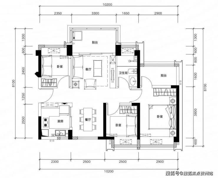 G02户型:约109㎡ 四房两厅两卫: