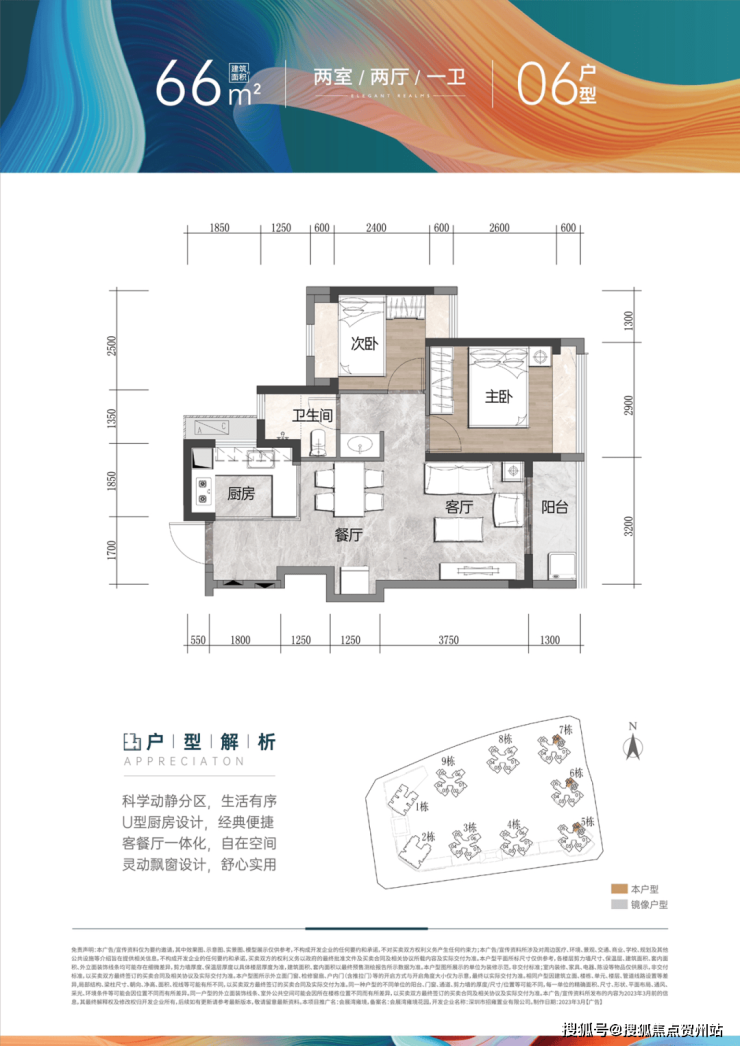 具体户建面约66㎡ 2房2厅1卫:南北通透,全凸窗设计,开放式U型厨房