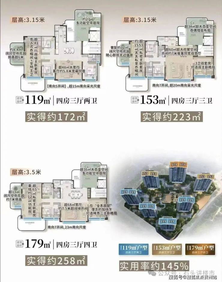 在售产品:建面约119-153-179㎡四代奢宅(最高约145%)