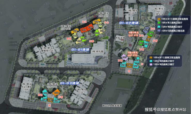 (1)105㎡3房2卫:双龙抱珠格局,朝东/南,阳台开间6.5米,适合刚需家庭。