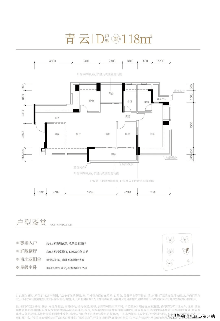118㎡的4房2厅2卫,设计的是横厅南北通透格局,进门赠送约4.6㎡的入户玄关(不计算在户型图内),客餐厅6.35米开间,LDKB一体化设计,4个卧室分别做到了主卧22.5㎡/次卧11.56m²/次卧9.52㎡/次卧8.25㎡(包含墙体飘窗),主卧带设备平台,客厅连接次卧出6.25米长大阳台,L型厨房,得房率约81%(不含赠送),阳台主朝东南向。套内面积95.58m²+赠送面积31.04m²=实际使用面积126.62m²,加上赠送后得房率约107.3%。