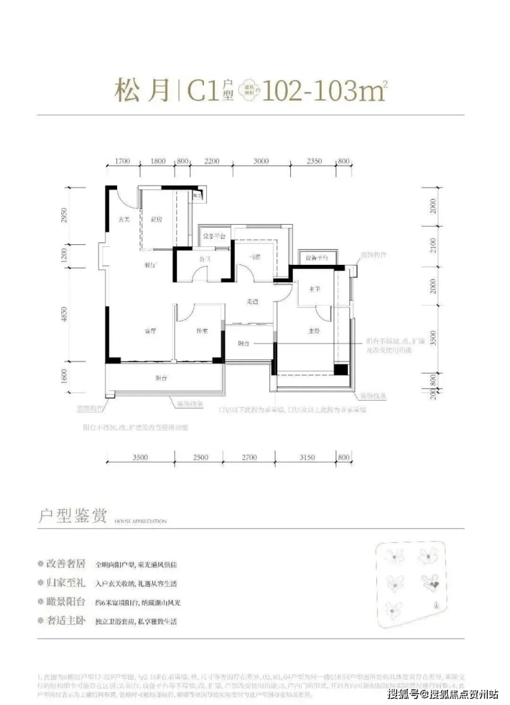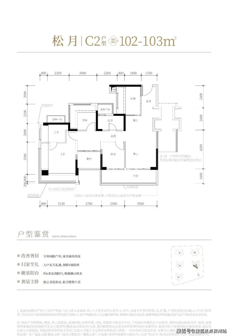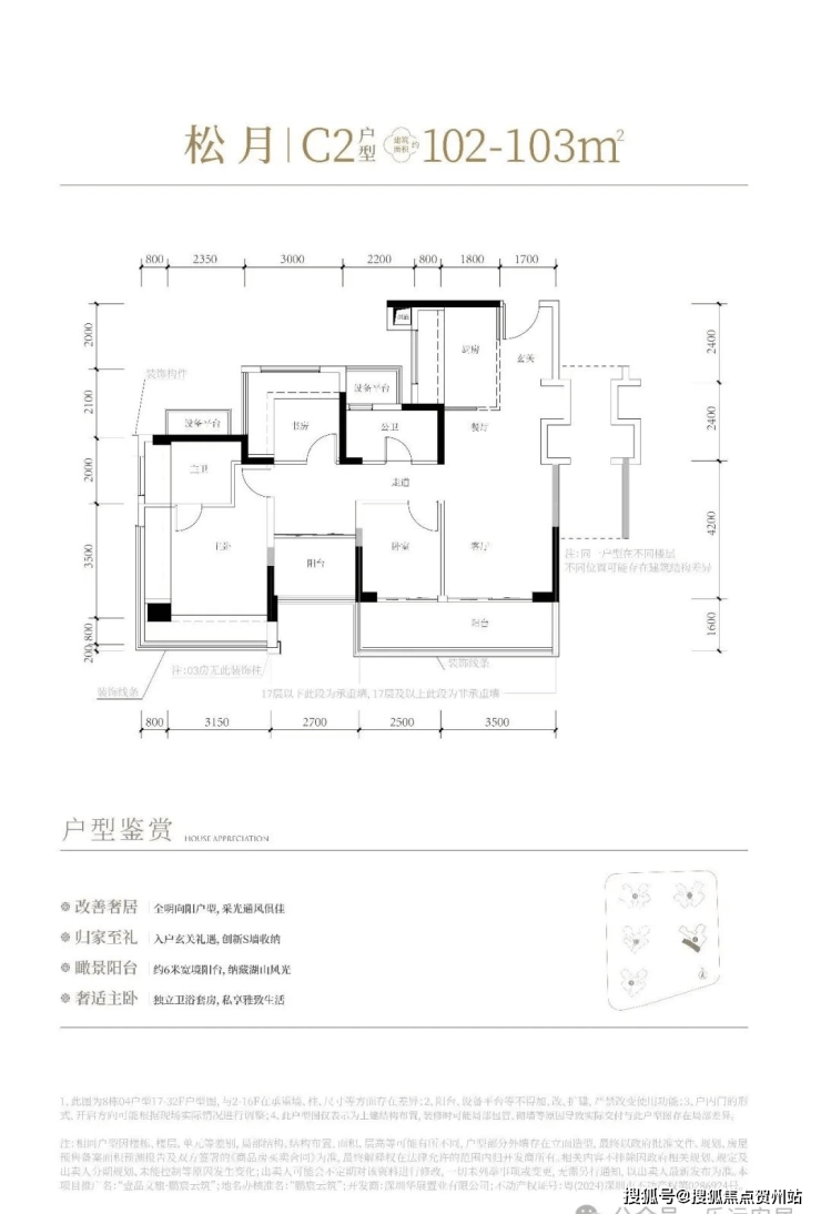 102-103㎡的4房2厅2卫(C1-C2户型),设计的是经典竖厅格局,进门入户玄关,客厅3.5米开间,LDKB一体化,S墙设计预留冰箱卡槽位,动静分区,四开间朝南,4个卧室分别做到了主卧17.98㎡/次卧8.37㎡/次卧8.1m²/次卧7.75㎡(包含墙体飘窗),L型厨房,公卫干湿分离带1个约2m²的设备平台,得房率约81%(不含赠送),客厅连接次卧出9.6m²的观景大阳台,东南或西南朝向。套内面积83.43m²+赠送面积23.86m²=实际使用面积107.29m²,加上赠送后得房率约104.16%。