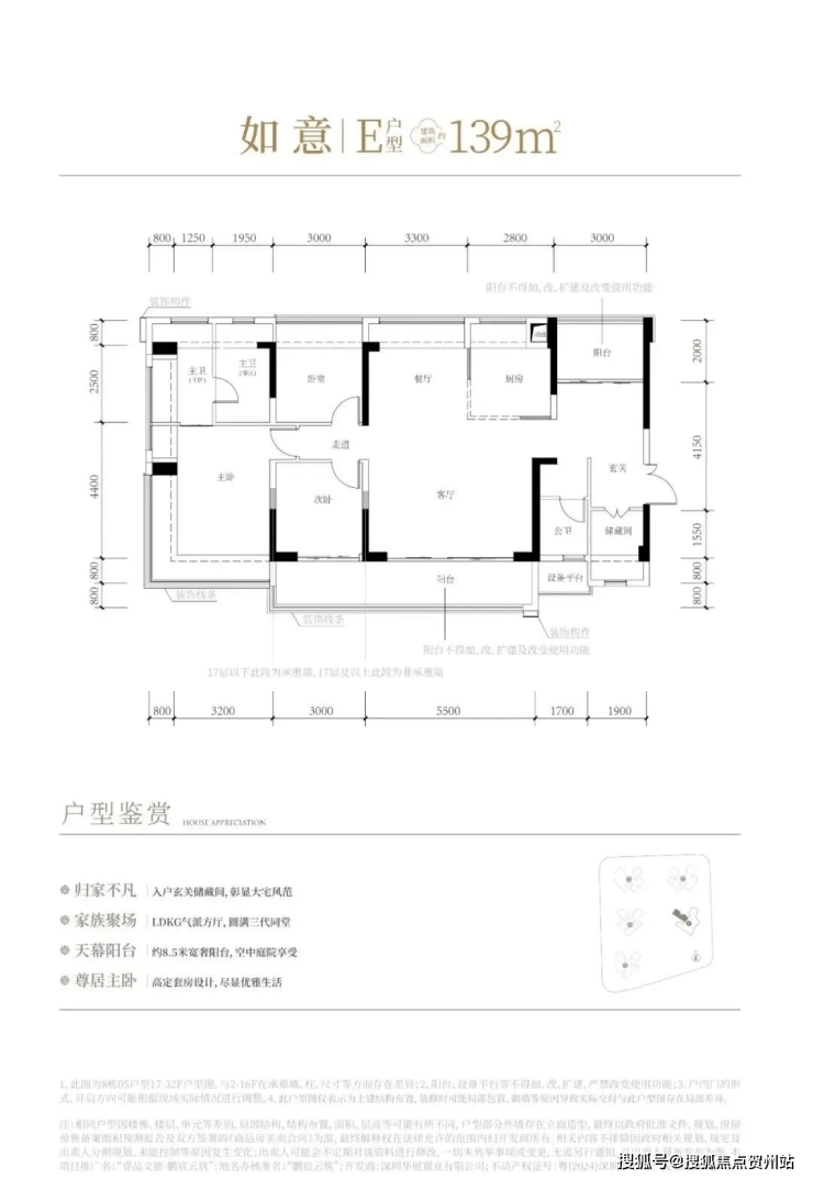 139㎡的4+1房2厅2卫,设计的是竖厅南北通透格局,进门赠送约5.2㎡的入户玄关(不计算在户型图内),客厅5.5米开间,LDKB一体化方厅设计,5个卧室分别做到了主卧27.56㎡/次卧10.2m²/次卧9.9㎡/次卧9.9㎡/次卧4.46m²(包含墙体飘窗),L型厨房,得房率约81%(不含赠送),客厅连接次卧出13.6m²的观景大阳台,主朝西南向。套内面积112.59m²+赠送面积31.98m²=实际使用面积144.57m²,加上赠送后得房率约104.01%。