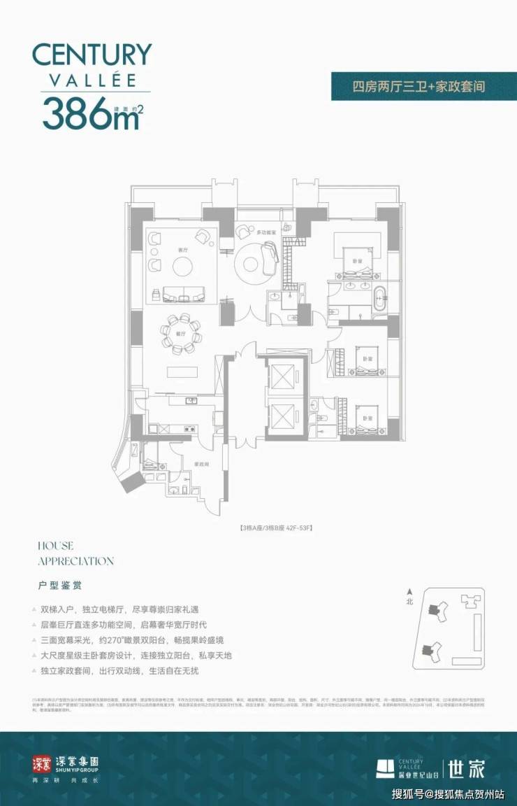 本次项目推出的建面约233㎡、280㎡、386㎡的三个户型,均采用客餐大横厅设计,全线贯通阳台,提供开阔视野。