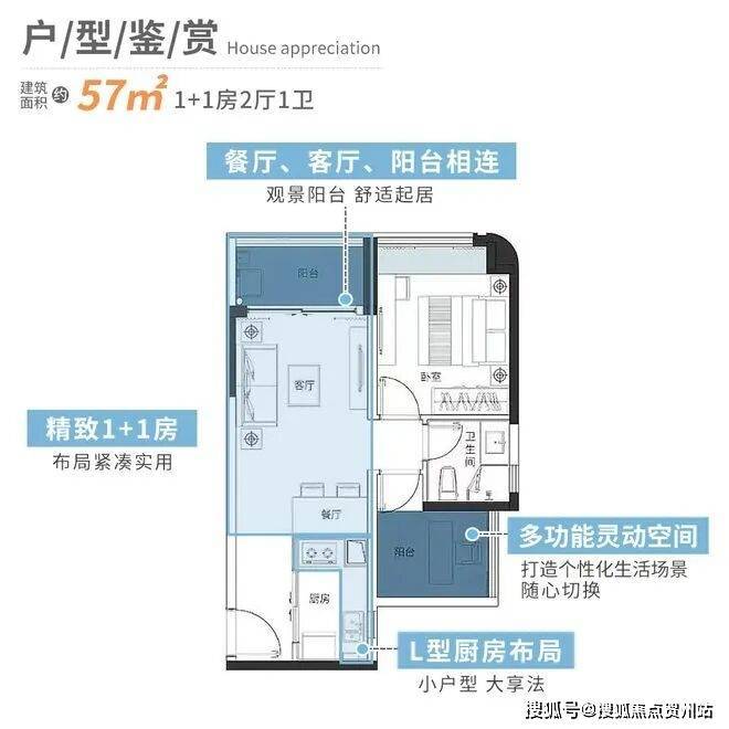 建面约57㎡的精致1+1房,餐厅、客厅和阳台相连的设计,增加了空间的通透感,减少了小户型的压抑感。
