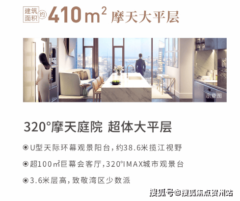 远超现有标准极限的约38.6米U型大阳台,320°摩天庭院、全屋落地窗、约3.6米舒适层高、约120㎡巨幕会客厅等极致的尊崇,刷新城市封面格局。