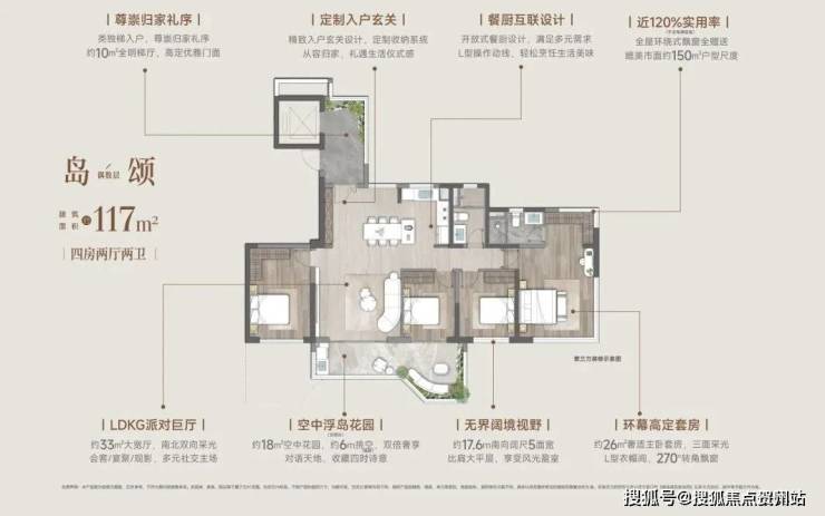 约117㎡户型,被飘窗、阳台、露台等赠送空间紧紧包围着,实用率达到119%,若是把专属电梯入户空间也算上,实用率直逼129%。