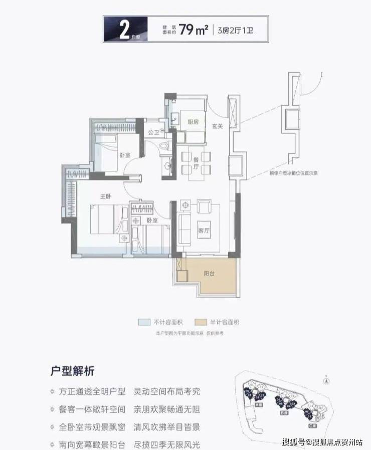 (1)79㎡三房两厅一卫:全南向设计,配备7个飘窗、6.2㎡L型阳台,三分离卫生间,赠送中央空调和洗碗消毒一体机。