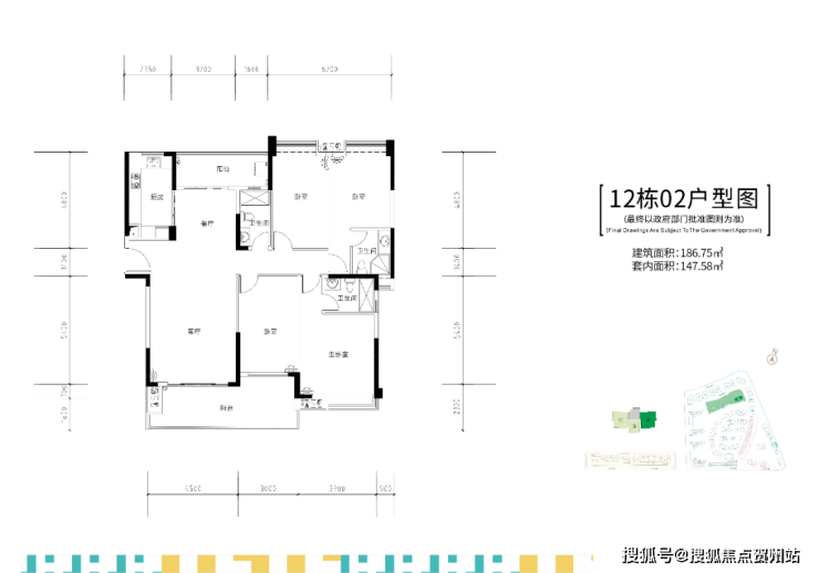 12栋两梯三户,建面约187㎡四房双套间户型。