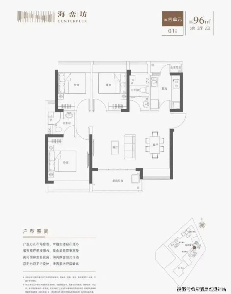 96㎡的3房2厅2卫,设计的是横厅南北通透格局,进门独立玄关,全屋飘窗,三开间朝南,U型厨房,得房率:71.15%(不含赠送),阳台主朝东南向。