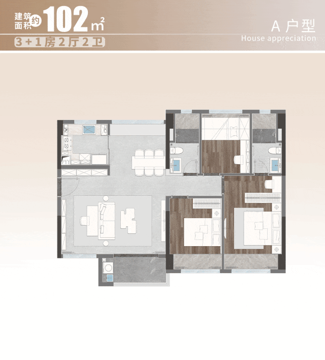 又如建面约102㎡3+1房2厅,近100%使用率,实际上享受到的相当于建面约120㎡户型的空间体验,改善优选。