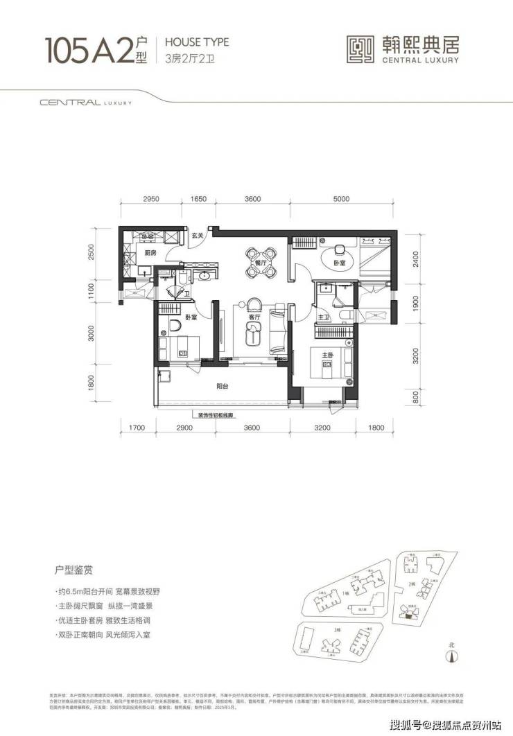 (1)105㎡3房2卫:双龙抱珠格局,朝东/南,阳台开间6.5米,适合刚需家庭。