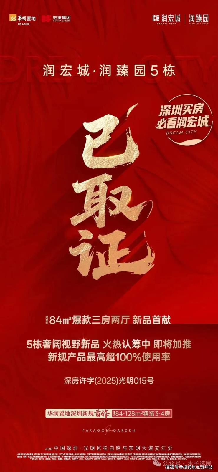 光明热销新盘华润润宏城二期【润臻园】5栋已取证:本次加推3栋288套房,户型建面为84-127㎡的3-4房。