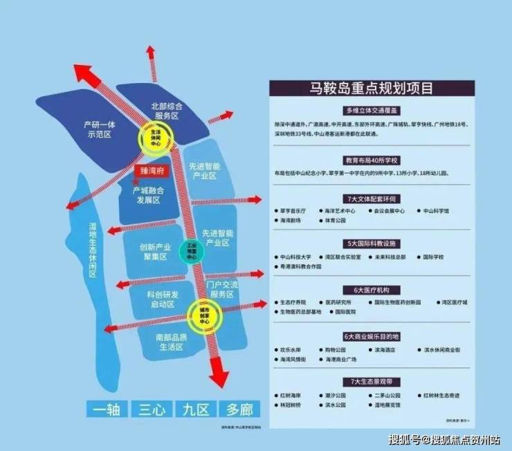 为了更好承接来自深圳的产业外溢、人口流入,马鞍岛高起点规划了“一轴、三心、九区、多廊”的发展布局,40所学校、13大城市公园等72大重量级顶配,意在打造集智造产业、科技金融、健康医疗、生态居住功能为一体的智创滨海新城。