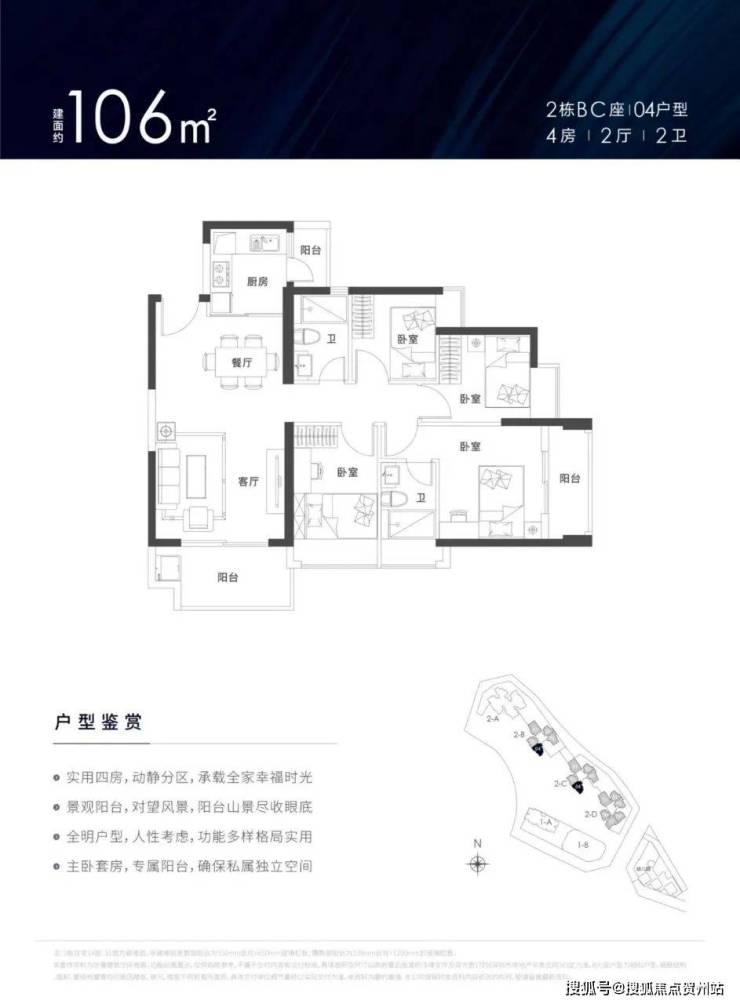 106㎡的4房2厅2卫,设计的竖厅格局,客厅主卧双阳台设计,厨房也带小阳台,三开间朝南,客厅朝西南向,高层可看山景。