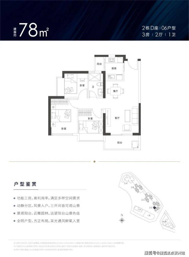78㎡的3房2厅1卫,设计的竖厅格局,三开间朝南,厨房带小阳台,客厅西南朝向,高楼层可看山景。