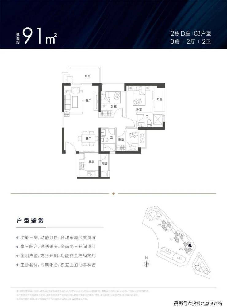 79-81㎡的3房2厅1卫,设计的竖厅格局,厨房带小阳台,客厅东北朝向,高层可看水库景观。