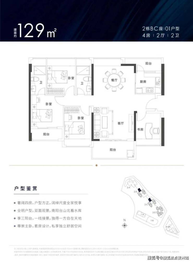 129㎡的4房2厅2卫,设计的竖厅南北通透格局,客厅主卧双阳台设计,厨房也带小阳台,客厅朝西南向,高层可享受双面景观