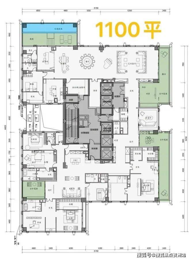 500㎡大平层,客厅约10米进深、开间12.5米,阳台开间约12.5米,5房(4套房)