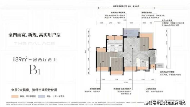 以89㎡的A1户型为例,采用LDKB一体化竖厅布局,客餐厅拥有270°超宽大的采光面,U型厨房设计还能做成开放式岛台功能,S墙体设计预留冰箱位提高空间利用率,公卫主卫都做到了干湿分离还带飘窗,四开间西北向可看科学公园景观,主卧更是做到了270°无柱转角大飘窗,这在89㎡面积段户型中还是不多见的。