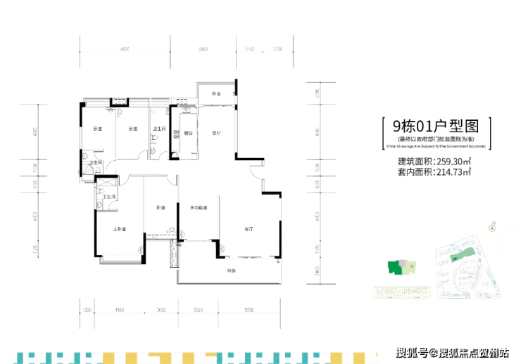 9栋,两梯两户,建面约255-259㎡五房大平层户型。