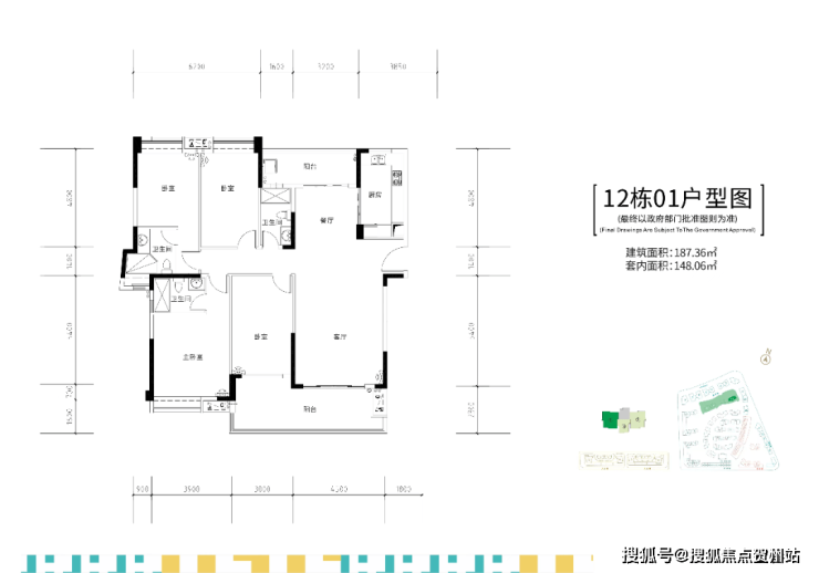 12栋两梯三户,建面约187㎡四房双套间户型。