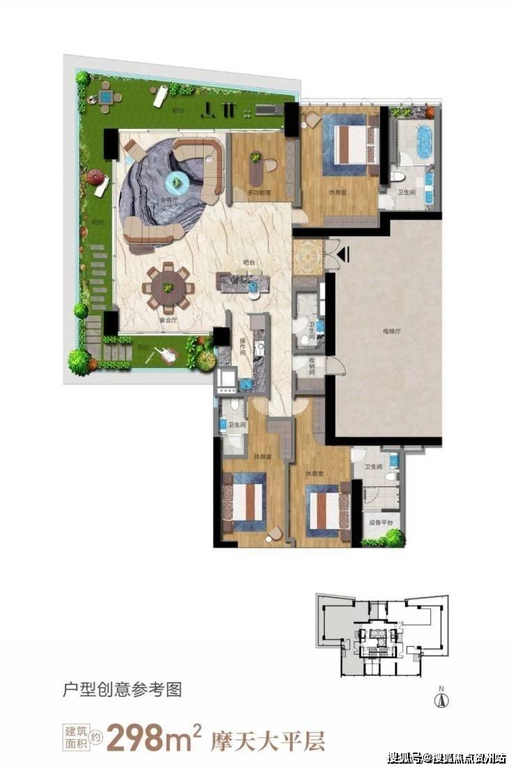 建面约298㎡摩天大平层户型:推开入户门,迎面而来是大理石吧台,不仅可以用作空间隔断,还能保护业主隐私。近100㎡会客厅,被320°U型大阳台包围住,加上全落地窗的设计,空间尺度、景观视野拉到最大。
