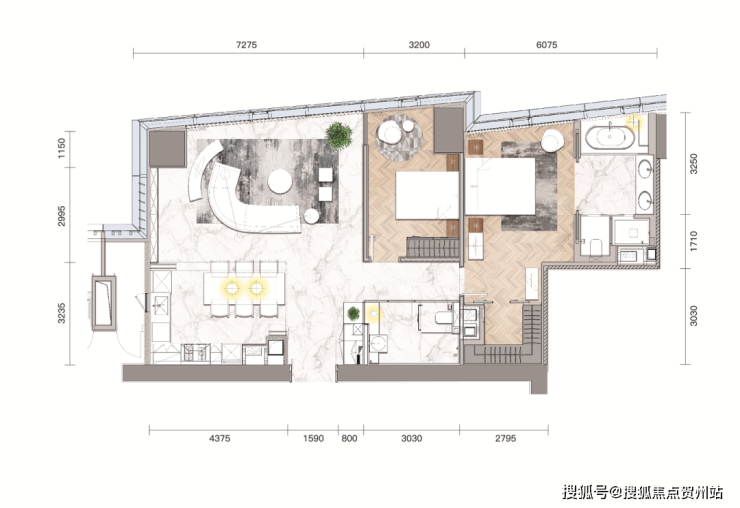 245㎡户型,从灰色系中汲取设计元素,用木与石灰调之间的互动,展现丰富的肌理效果。