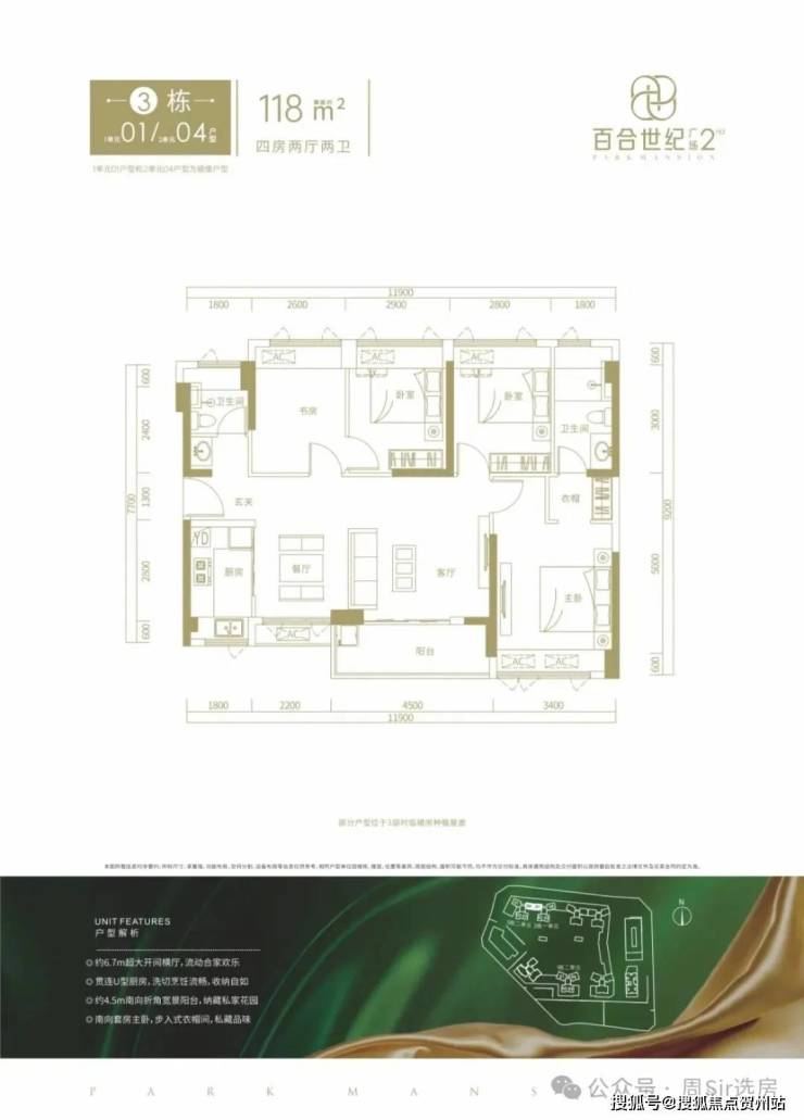 118㎡的4房2厅2卫,3栋1单元01/3栋2单元04户型,设计的是横厅南北通透格局,进门入户玄关,客餐厅6.7米开间,LDKB一体化设计,四开间朝南,得房率约76%(不含赠送),阳台主朝正南向。套内面积89.68㎡+赠送15.06㎡=实得104.74㎡,加上赠送得房率约88.76%。