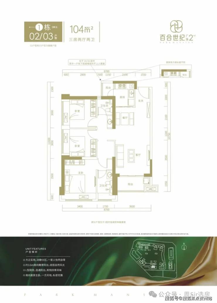 104㎡的3房2厅2卫,1栋02/03户型,设计的是竖厅格局,客厅3.6米开间,LDKB一体化设计,三开间朝南,动静分区,得房率约76%(不含赠送),正南朝向。套内面积79.04㎡+赠送10.31㎡=实得89.35㎡,加上赠送得房率约85.91%。