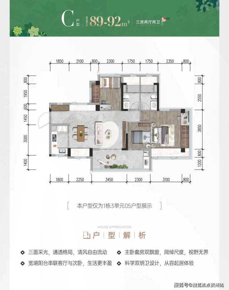 三开间向阳,客厅连接次卧出5.75米长的大阳台,其中一个次卧和主卧是两面采光,主卧也做到了270°无边转角飘窗。