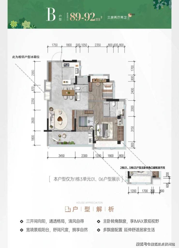80㎡户型的放大版,同样是LDKB一体化的竖厅格局,客厅3.45米开间,有S墙设计预留冰箱卡槽位。该户型东南和西北朝向都有,东南看小区园林,西南看会展城中轴,观感都算不错。