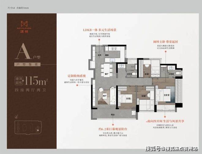 115㎡的4房2厅2卫,A户型(1栋1单元05户型),设计的是经典竖厅格局,进门入户玄关,LDKB一体化,S墙设计预留冰箱卡槽位,四开间朝南,动静分区,主卧双面飘窗,客厅连接次卧出6.2米长的巨幕大阳台,U型厨房,公卫三段式分离,得房率76.77%(不含赠送),套内面积88.71㎡,东南朝向,靓点是2个最小的次卧都不用睡飘窗。