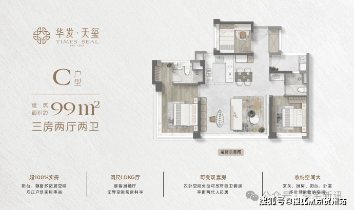 约110㎡四房两厅两卫:约16米通风面,户户是端户;约28㎡行政级端卧套房,270°景观视野,360°环统式采光