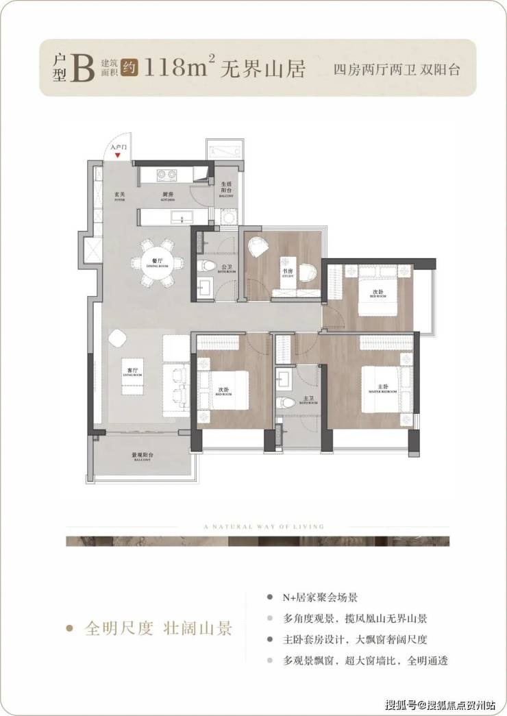 户型背山面海,超大的窗墙比将窗外无价的山海资源揽入户内,所有户型都可以看到开阔的山景,部分户型高楼层可以同时看到山海景观;南向大面宽、小进深,结合现代人家居理念的LDKB一体化设计,打造城市之芯的巨幕山海。