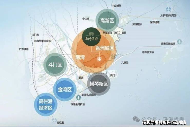 ▫南湾位居珠海地理几何中心,东面一桥之隔即为香洲老城区,南面与横琴粤澳深度合作区、十字门中央商务区一山之隔;西面规划鹤州新中心;