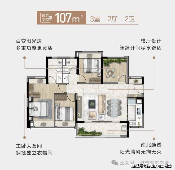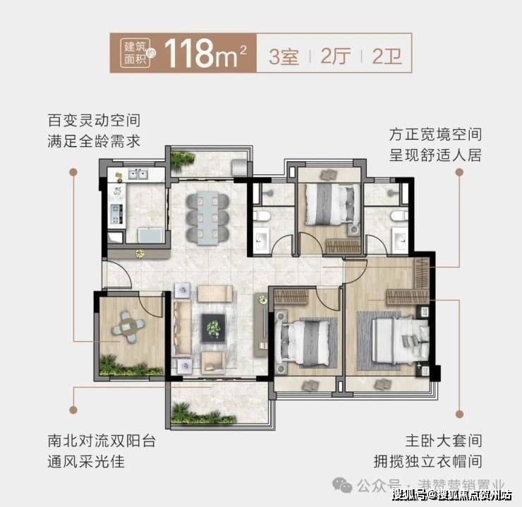 拥有南北通透双阳台,让居住空间更显大气。双主卧套间设计,采用南向全飘窗,细节之处彰显主人尊崇。超高的使用率,功能上回归家庭,布局上强调平衡,让空间更实用。
