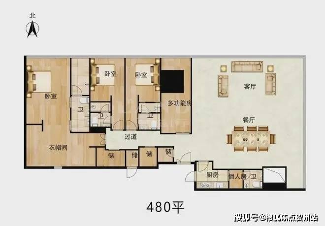 480㎡01/02户型 西北 东北480平 3+1房(三套房)客厅105平,主卧65平奢阔设计